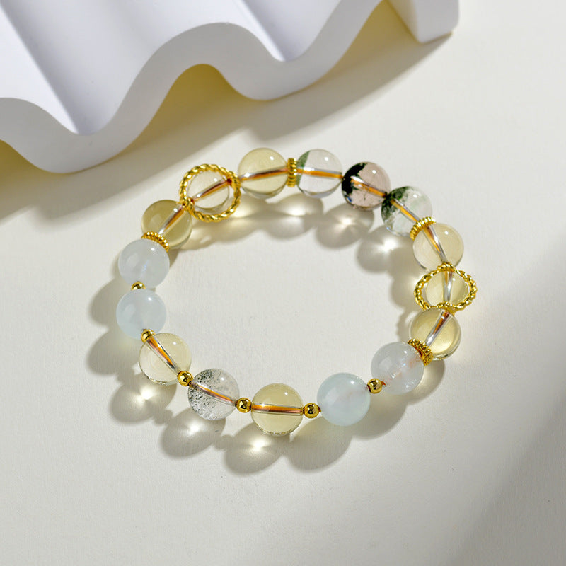 Featuring yellow crystal, aquamarine, and green phantom stones, this bracelet channels earthy energies to balance emotions and attract positivity in relationships.