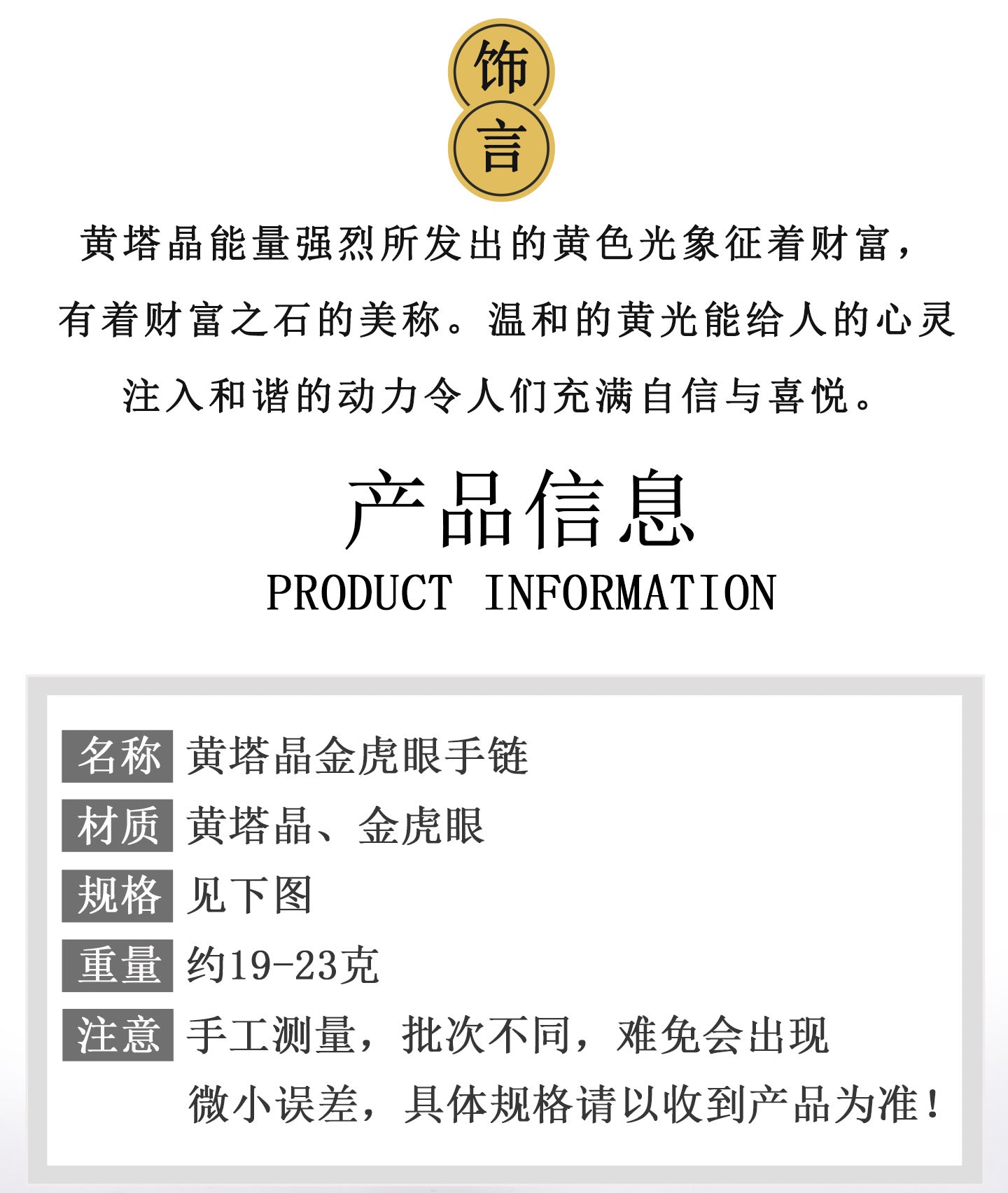 | Material | Natural Yellow Crystal, Gold Tiger Eye, Metal Alloy |