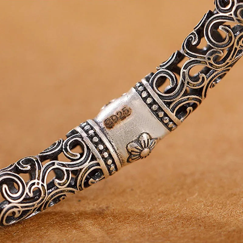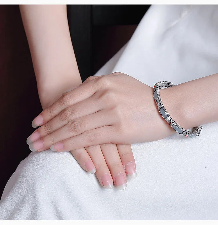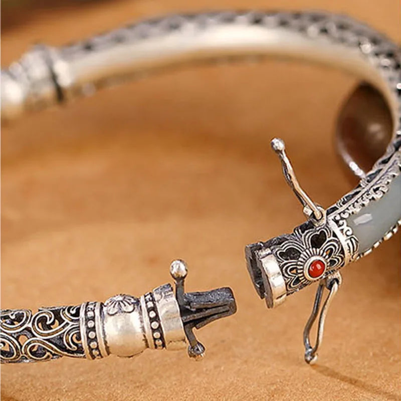 The hollow butterfly bangle is not merely an ornament; it is a small poem worn upon the wrist. In form it speaks of lightness — openwork wings that catch the air like a caught moment — and in material it blends silver-tone clarity with the soft calm of jade. This piece is crafted in a platinum-plated Tibetan-silver alloy, finished to a bright, enduring sheen, and set with a single polished jade cabochon as its green heart. Its style is vintage, an echoed memory of filigree technique where negative space becomes decoration.