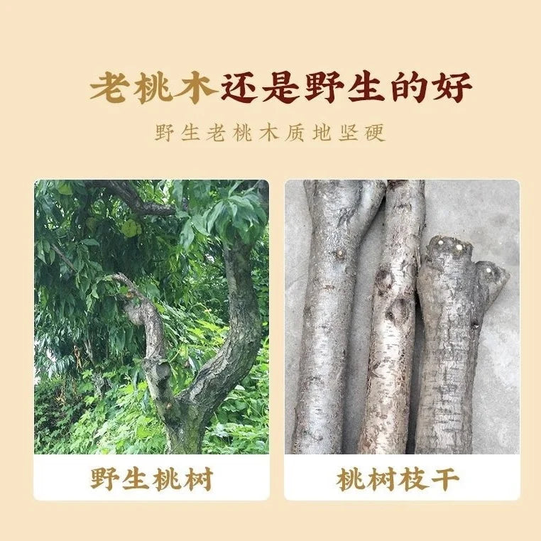 Selected old peach wood with warm grain and natural patina; each bead carries subtle clearing energy and a lived-in texture.