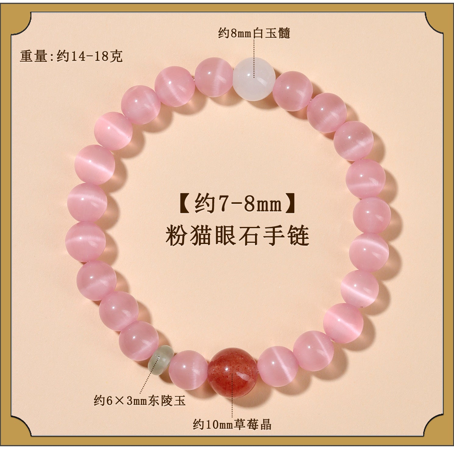This bracelet embodies that harmony, with each pink cat's eye stone acting as a conduit for positive chi, or life force. The strawberry designs, inspired by nature's bounty, align with Daoist principles of balancing yin and yang—softness and strength—to foster inner peace and outward grace. By wearing this piece, you invite the universe's flow of good fortune, much like the gentle turning of seasons in traditional feng shui practices.