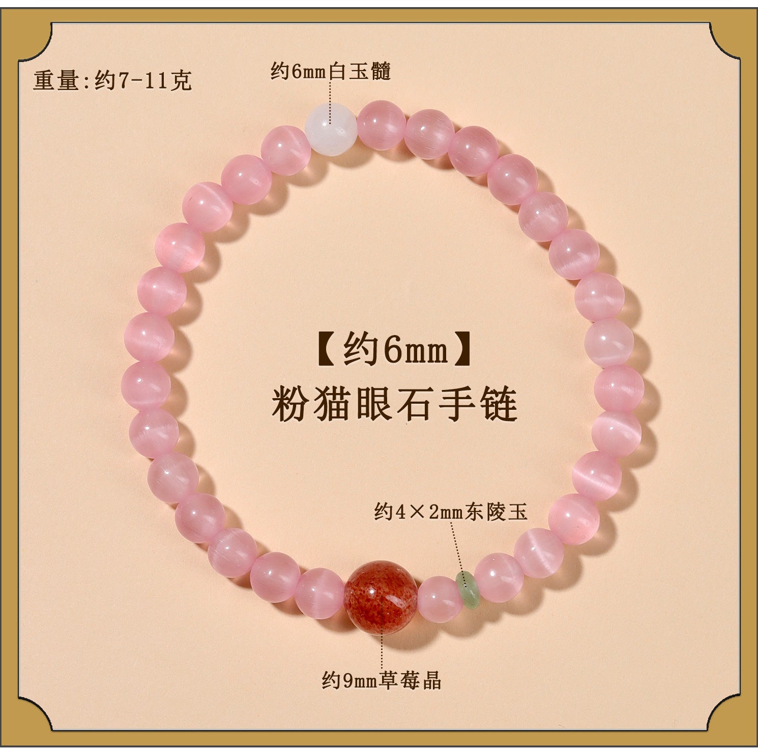 In Buddhist thought, mindfulness and compassion are key to a fulfilled life. The bracelet's delicate form encourages a heart of gratitude, its strawberry elements symbolizing the joy found in simple moments. As you adorn it, let it serve as a reminder to cultivate kindness, turning each day into an opportunity for spiritual growth. The cat's eye stones, with their protective glow, are said to shield the wearer from discord, making it an ideal companion for meditation or social gatherings.