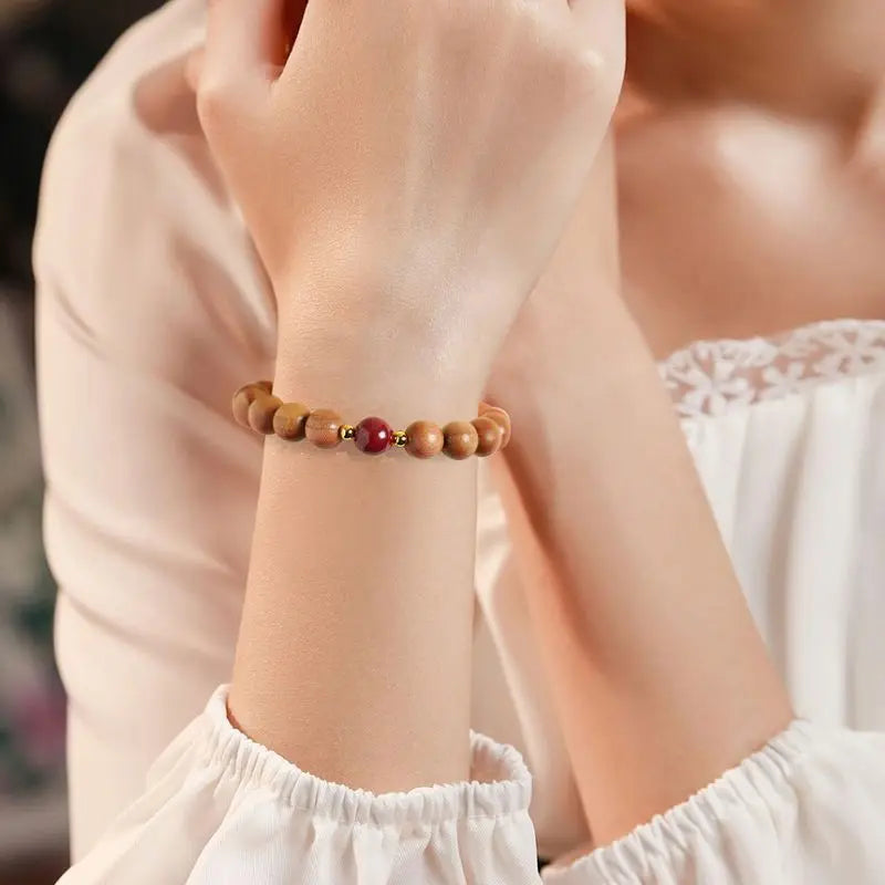 In folk feng shui the peach tree is known as the guardian of thresholds, its wood absorbing years of protective qi. This rosary is carved from wild old peach wood gathered from ancient groves, each bead retaining the calm grain and faint resin scent of time. Cinnabar beads are woven as warding nodes, and aventurine nods with its gentle green light to attract opportunity.