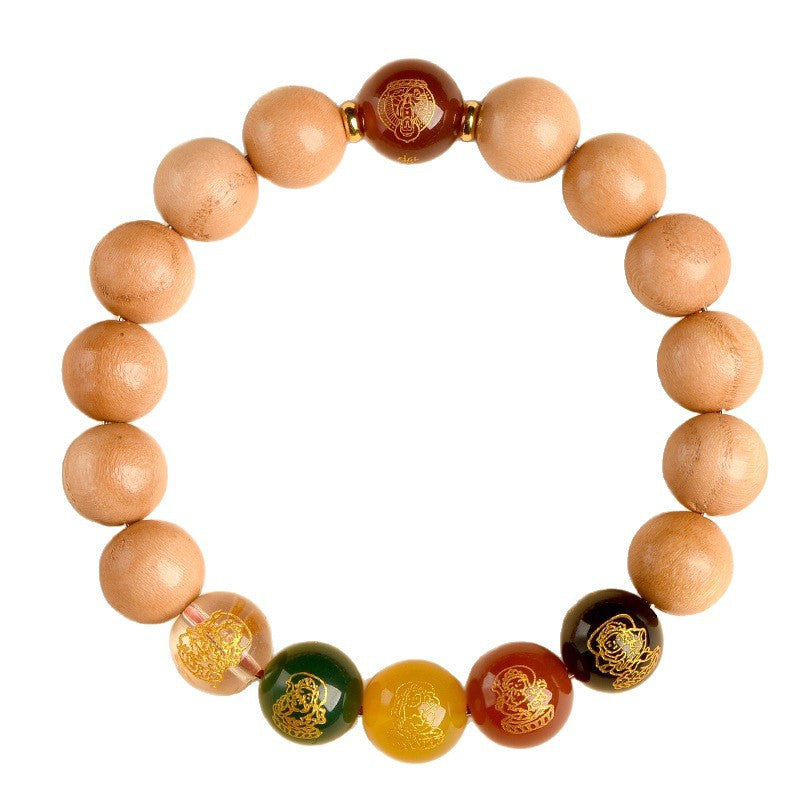This bracelet harmonizes the celestial and terrestrial realms through its design. The twelve zodiac birth Buddhas represent the cyclical nature of existence, each Buddha acting as a guardian for one's birth year, offering tailored blessings and guidance. Meanwhile, the five-direction wealth gods draw upon the energies of north, south, east, west, and center, ensuring a balanced influx of fortune and removing obstacles to success.
