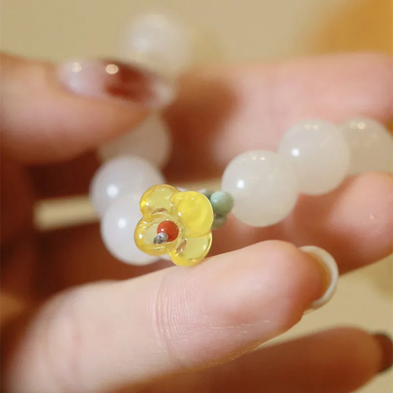 材质与工艺的结合,是这件作品的另一层寓意。玉珠由天然半宝玉石精工抛光,表面细腻,光泽含蓄;手工绳结遵循传统结艺,结实且富有装饰性。佩戴于左腕或右腕,皆可体现佩者的气质:静雅而稳重,亲和而不浮躁。赠予父母、伴侣或至亲好友,既是一份美物,也是一份祈愿:愿你安好,愿你常在,愿心净而路正。