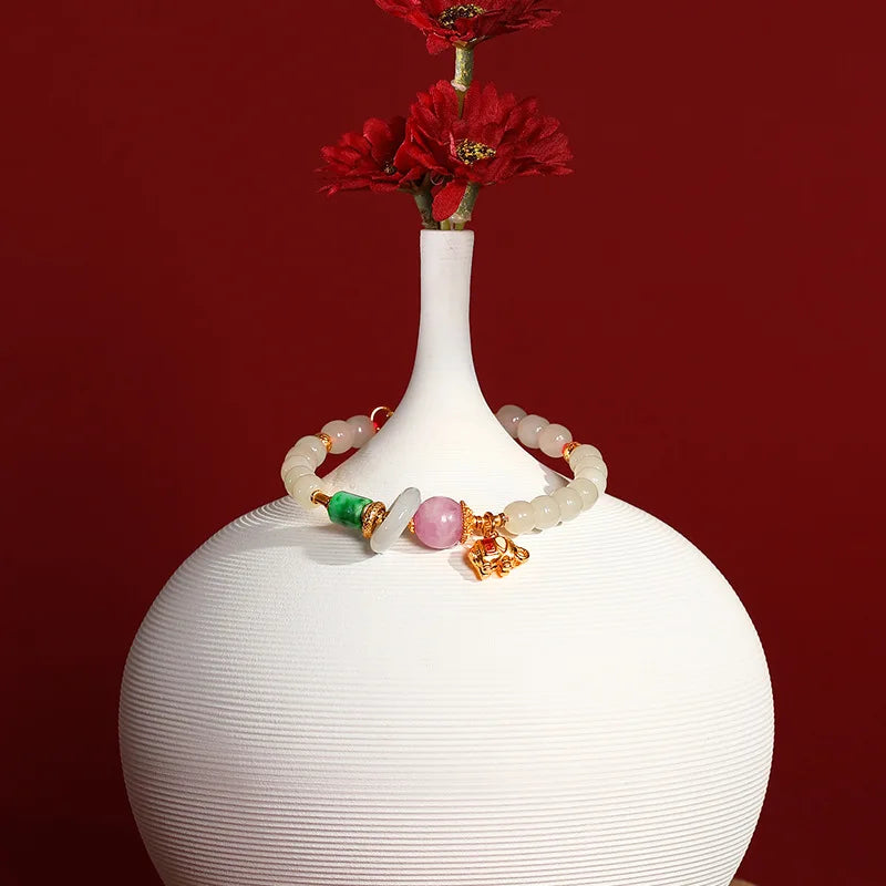 Hetian jade (和田玉) has long been sung in the annals of Chinese culture as a stone of virtue and poise. Its warm, oily glow and subtle translucence were admired by sages and craftsmen alike. This women's bracelet takes that ancient lineage and translates it into a wearable talisman: hand-polished natural Hetian jade beads are strung in an invisible setting, punctuated by Tibetan-silver ornaments and gold-plated cord ends that catch the light without loudness.